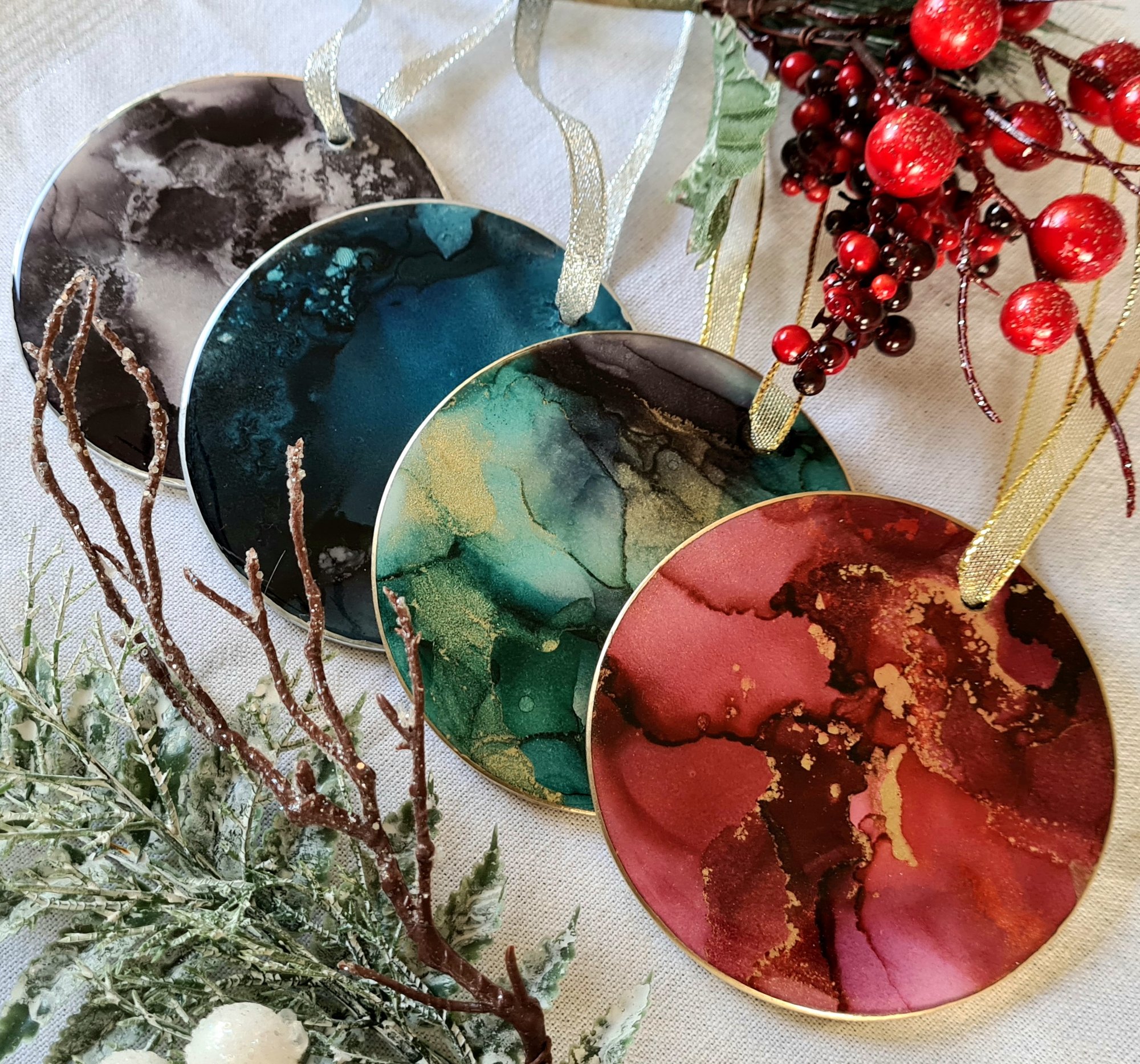 Made with bright alcohol inks and sealed with glossy resin, each of these pieces is absolutely unique.