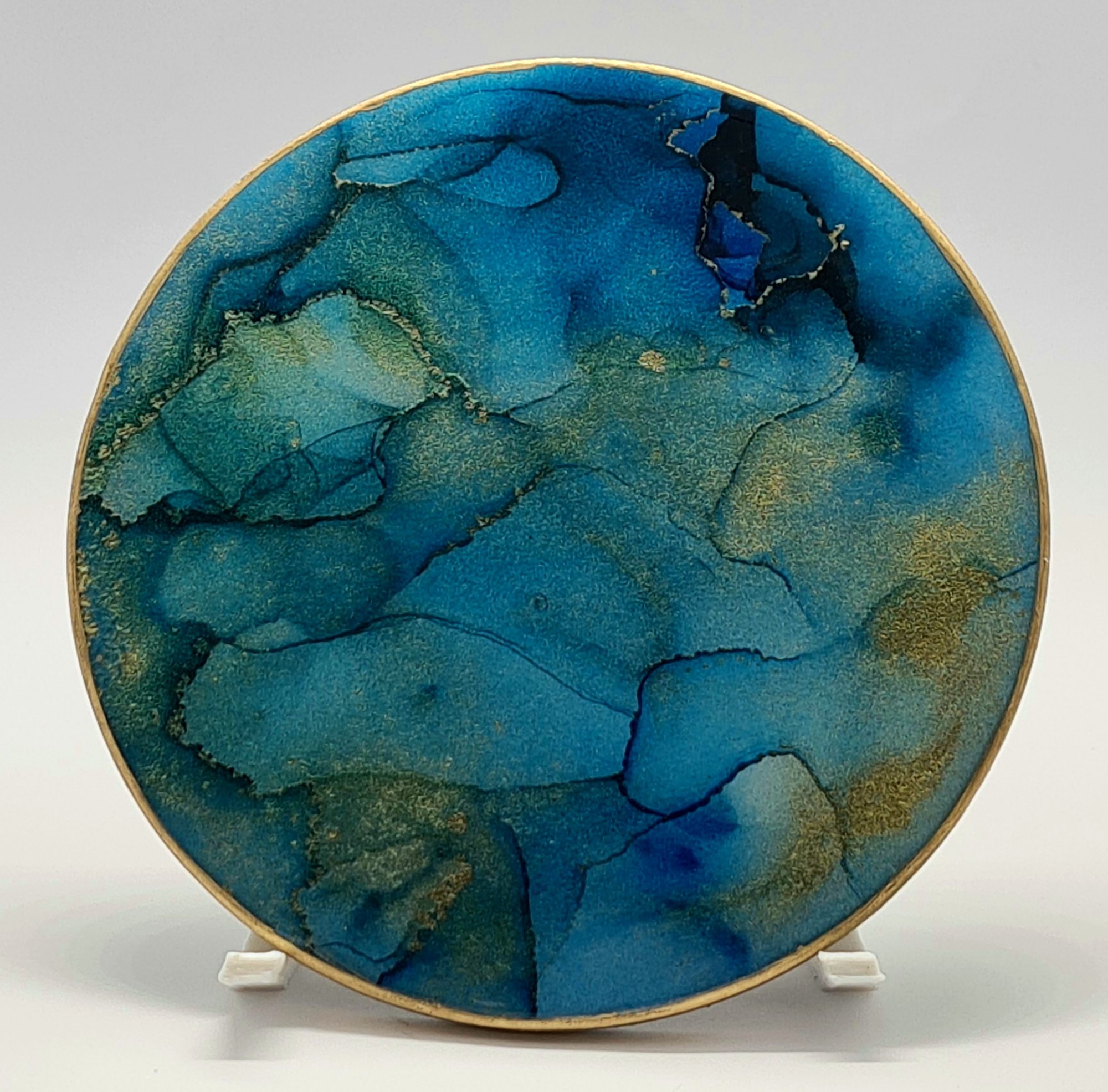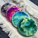 Made with vibrant alcohol inks and sealed with heat-resistant resin, each of these pieces are absolutely unique. These coasters have a cork backing which helps to protect your surfaces from heat and scratches.