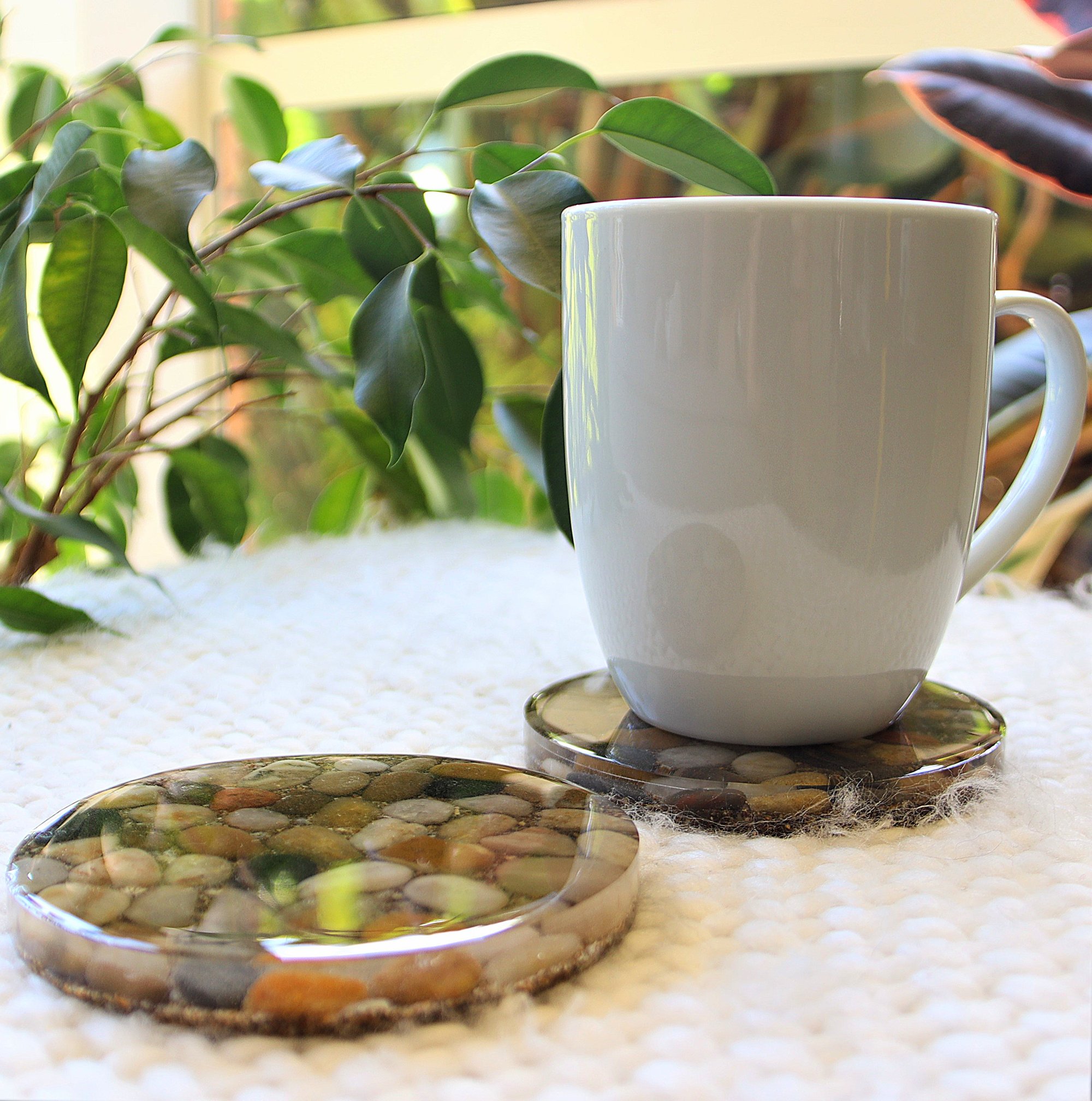 Made with natural pebbles set in a bed of real sand, this coaster set has mesmorising depth in stunning neutral tones.