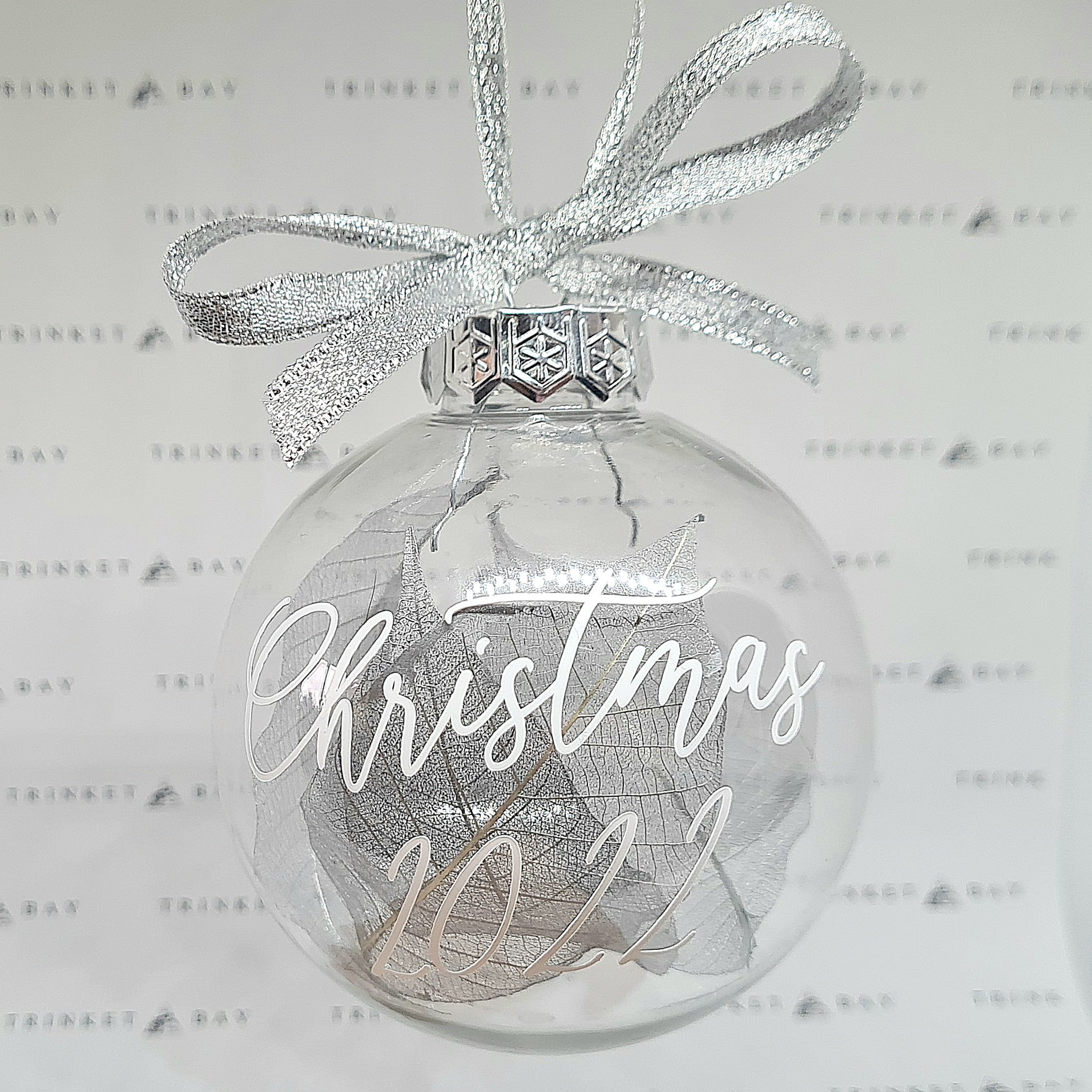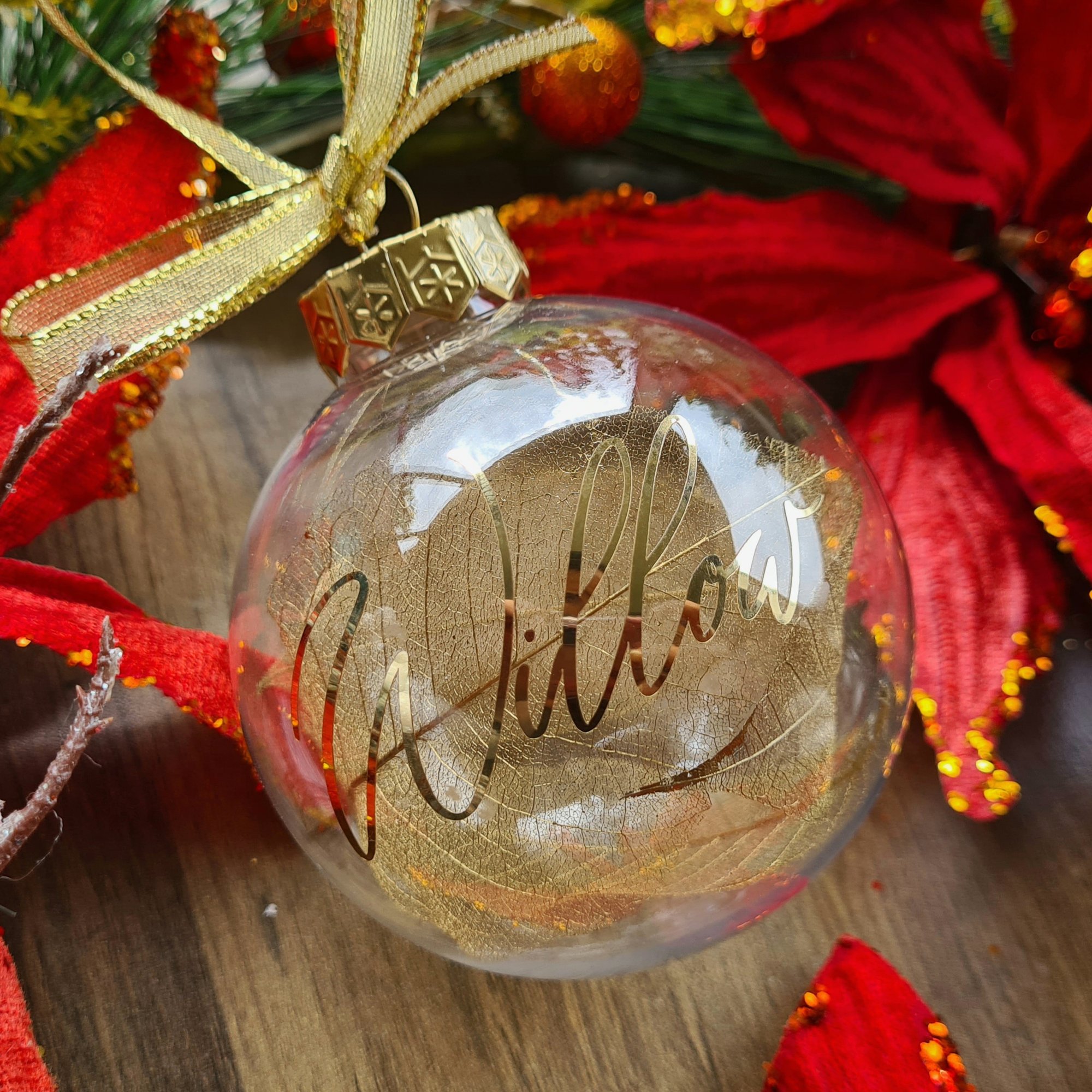 The metallic dried leaves inside each bauble make for a delicate backdrop to your custom lettering. These baubles are made of high quality shatterproof plastic so they are safe around kids or pets, and will be treasured for years to come.