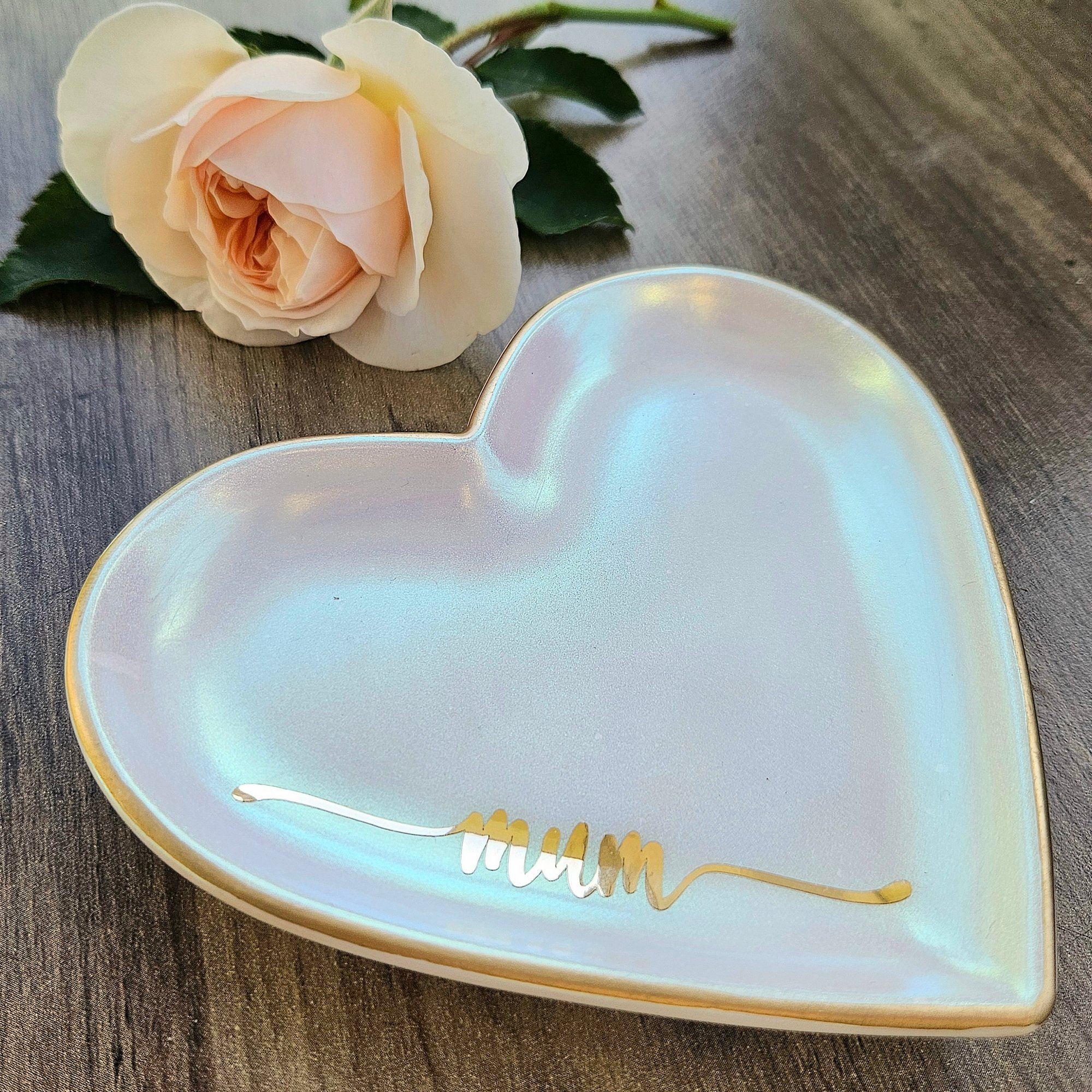 With a pink pearl finish and metallic gold trim, this heart-shaped trinket dish makes for a pretty accent to a dresser or nightstand.