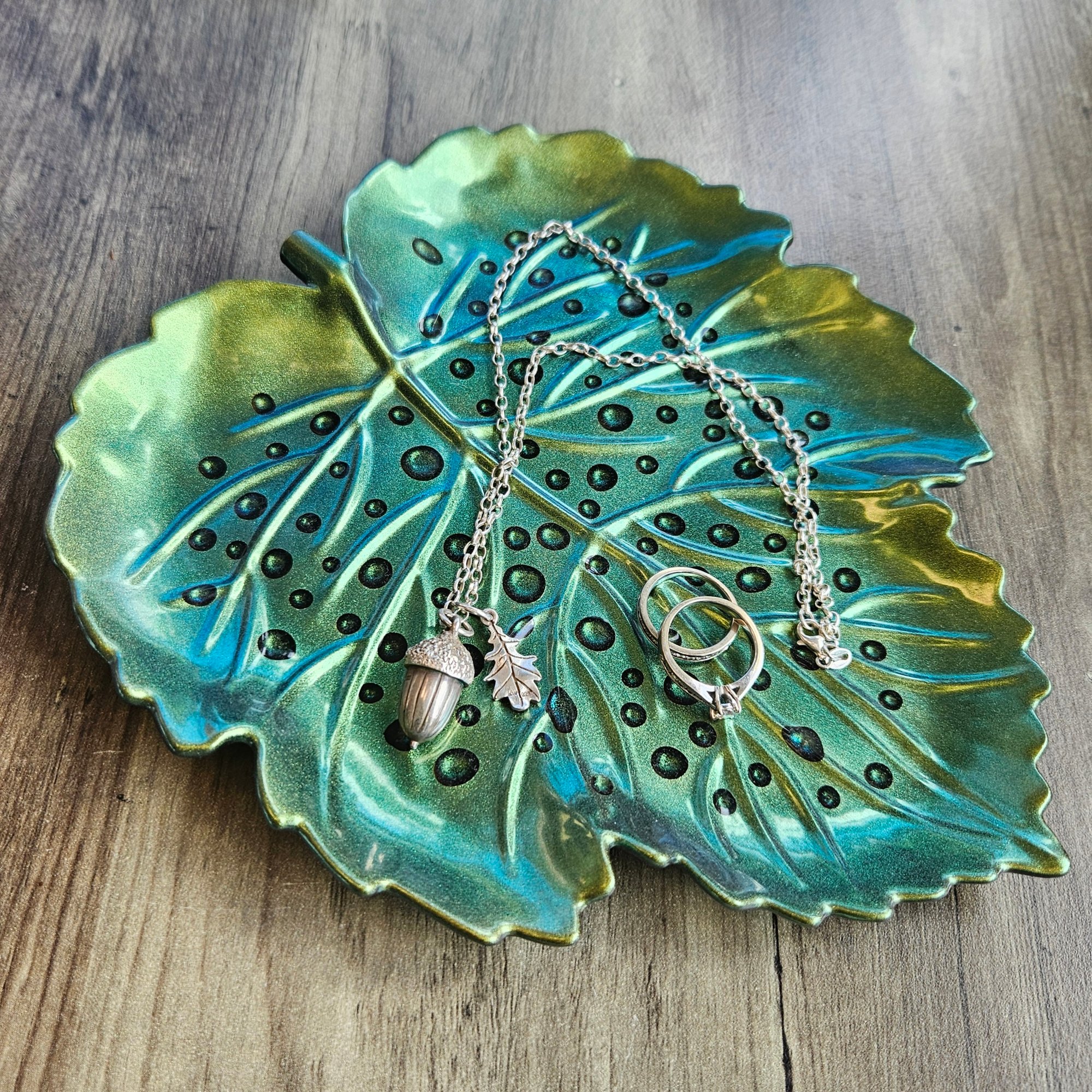 This large leaf shaped dish is the perfect spot for your jewellery, perfumes or keys.